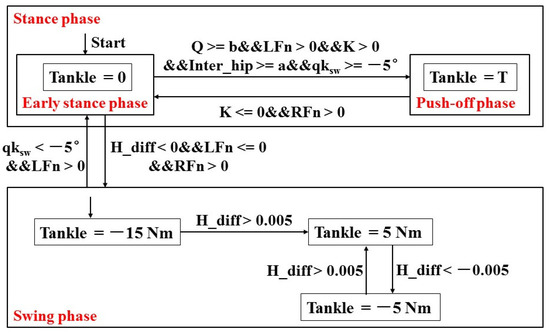 The controller framework of the ankle joint during the single gait cycle is presented in Figure 5. The ankle torque of the biped robot during the single gait cycle mainly includes two stages: the stance stage and the swing stage. The stance stage includes the early stance stage and the push-off stage. When the stance leg is at the early stance stage and the ankle joint is in the passive mode, the ankle torque is 0. As the swing leg moves forward to the initial position of push-off, the ankle joint of the stance leg starts to push-off. The initial position is the state just after the push-off phase; thus, the stance leg is at the early stance phase, and the corresponding ankle torque is 0 N∙m. As the stance leg moves forward, when the global variable Q is greater than or equal to the angle b, the inter-leg angle is greater than or equal to a, and the knee angle qksw of the swing leg is greater than −5°, the left leg begins to push-off. The torque curve is applied to the ankle joint of the left leg. When the push-off angle K is less than or equal to 0°, and the ground reaction force of the right leg is greater than 0 N, the ankle torque becomes 0 N∙m at the end of the push-off phase. When the height difference between the toe and heel of the left foot (H_diff) is less than 0, the ground reaction force of the left leg (LFn) is less than or equal to 0 N, the ground reaction force of left leg (RFn) is greater than 0 N, and the left foot lifts off the ground and begins to swing. To prevent the foot from stumbling with the ground, the height difference is considered as the transition of the state machine of the swing stage. The height difference of the left foot is used to control the ankle angle so that the sole of the foot is basically parallel to the ground.