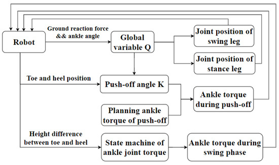 The overall controller framework of the bipedal robot is shown in Figure 6. The global variable Q is determined by the ground reaction force and the ankle angle qast. The target positions of the hip and knee joints of both legs are calculated using the global variable Q. When the posture of the bipedal robot is consistent with the push-off position, and the global variable Q is equal to b, the ankle torque of the stance foot is calculated based on the push-off angle K during the push-off phase. The proportional-derivative (PD) controller is used to command the desired position of the hip and knee joints. The amount of the ankle push-off is applied to the ankle joint of the stance leg. The ankle joint is actuated by the torque mode in the Simscape toolbox. Ankle torque during the swing phase is calculated using the height difference between the toe and the heel of the swing leg on the basis of the state machine of the ankle joint torque, as shown in Figure 5.