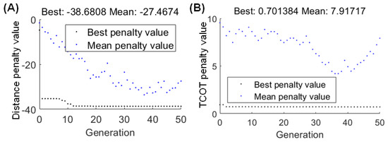 Optimal results of the genetic algorithm. (A) Walking distance. (B) Mechanical cost of transport.