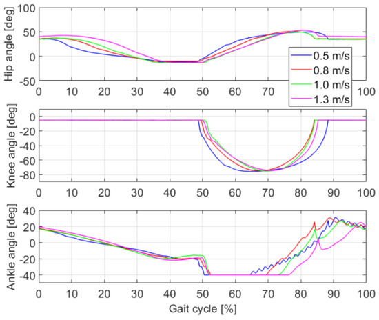 To further study the influence of ankle push-off on the walking speed of bipedal robots, the joints kinematics during one gait cycle of the bipedal robot at four walking speeds are identified, as shown in Figure 8. The optimal parameters of the torque curve for the ankle joint corresponding to the four walking speeds are listed in Table 3. When the walking speed changes from 0.5 m/s to 1.3 m/s, the hip, knee, and ankle joints of the bipedal robot exhibit similar movement trends. At the early stance phase, the hip joint flexes from 40° to −10°, the knee joint remains at −5°, and the ankle angle is reduced from 20° to −20°. During the ankle push-off phase, the ankle angle increases, whereas the hip and knee remain stable. During the swing period, the hip joint is extended from −10° to 50° and is then decreased to 40°. The knee joint is firstly flexed to −75° and then extended to −5°. To prevent the foot of the swinging leg from stumbling with the ground, the state machine of the ankle torque is used to keep the foot parallel to the ground. Thus, the ankle angle fluctuates slightly during the swing phase.