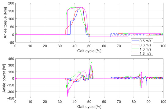 Figure 10 shows the push-off torque and power produced by the ankle joint of the bipedal robot at different walking speeds. The gray area represents the positive work produced by the ankle joint during the ankle push-off phase. When the walking speed is 0.5 m/s, the ankle torque occurs at approximately 37.1% of the gait cycle. When the walking speeds are 0.8 m/s, 1.0 m/s, and 1.3 m/s, the ankle torque curve occurs at approximately 34% of the gait cycle. With increasing speed, the timing of the ankle torque occurs earlier. When the speed increases to a certain extent, the timing difference of the ankle torque is small. When the walking speed is 0.5 m/s, the timing of the ankle push-off occurs at 44.4% of the gait cycle. When the walking speed is 0.8 m/s, the timing of ankle push-off occurs at 43.3% of the gait cycle. When the speed is 1.0 m/s, the timing of ankle push-off occurs at 37.5% of the gait cycle. With increasing walking speed, the timing of ankle push-off occurs earlier, and the timing difference is significant. However, when the speed is 1.3 m/s, the timing of ankle push-off occurs at 41.3% of the gait cycle, which may be due to the increasing negative work generated by the ankle joint.