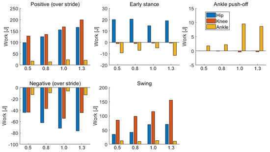 The whole gait cycle can be divided into three phases: the early stance phase, ankle push-off, and the swing phase. In the early stance, the hip joint mainly generates positive work, whereas the knee and ankle joints produced negative work. The hip joint contributes to push the center of mass forward and keep the torso leaning forward. The ankle joint mainly contributes to the positive work during the ankle push-off phase and provides energy for the bipedal robot system. The ankle push-off may reduce the velocity of the impact of the leading leg and pushes upward on the center of mass. The work generated by the hip and knee joints comprises only a small portion of total energy, which means that the hip and knee joints are almost passive state during ankle push-off phase. At a fast walking speed (approximately 8.69 J at 1.3 m/s), the work produced by the ankle during ankle push-off is 4.82 times than that produced at a low walking speed (approximately 1.79 J at 0.5 m/s). With increasing walking speed, the work produced by the ankle joint during ankle push-off phase firstly increases and then decreases. During the swing phase, the work generated by the knee and hip joints gradually increase with increasing speed. The work generated by the knee joint at the fast walking speed (approximately 155.45 J at 1.3 m/s) is 83.27% larger than that at the slow walking speed (approximately 84.82 J at 0.5 m/s). The work produced by the knee joint contributes to flex the swing leg and prevents the foot of the swing leg from stumbling on the ground. In the early stance, the work produced by the hip joint during fast walking (at speeds of 1.0 m/s and 1.3 m/s) is significantly less than that generated during walking at the low speeds (at speeds of 0.5 m/s and 0.8 m/s). While the work generated by the ankle joint during the ankle push-off phase during fast walking is significantly greater than that generated at a low speed.