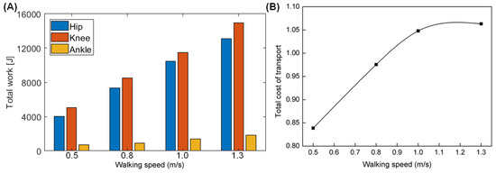 Figure 13 shows the total change in energy of the bipedal robot during walking. The mechanical work of the hip, knee, and ankle varies with speed, as shown in Figure 13A, and the MCOT of the bipedal robot changes with speed as shown in Figure 13B. The work produced by each joint of the robot increases with increasing speed, with most of the work produced by the knee and while the least produced by the ankle joint. The energy consumption of the robot increases with increasing speed, because more work is needed to change the motion direction of the center of mass during step-to-step transition [21]. The maximum walking speed of the biped robot is 1.3 m/s, with a corresponding MCOT of about 1.06. Studies have shown that during normal walking, human beings choose the optimal gait corresponding to the lowest energy consumption. The preferred walking speed is 1.21 m/s, and the corresponding MCOT is 0.33 [32,33]. By comparison, the energy consumption of the biped robot (at speed of 1.3 m/s) is about 3.2 times that of human beings (at speed of 1.21 m/s).