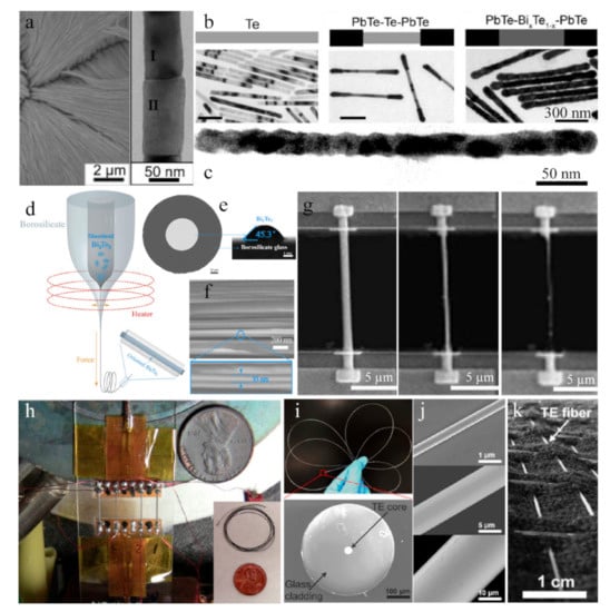 Figure 1. (a) Scanning electron microscopy (SEM) images of the Bi2Te3/Te multisegmented nanowires based on the top-view and close-up observation. Reproduced with permission [26]. Copyright 2007, American Chemical Society. (b) Schematic sketch and microstructure characterization for the formation of PbTe/BixTe1–x/PbTe dumbbell-like, heterostructured nanowires. Reproduced with permission [27]. Copyright 2010, Wiley. (c) TEM images of the interfaces of an individual Te/Bi core/shell nanowire. Reproduced with permission [33]. Copyright 2008, Wiley. (d) Sketch of the molten core drawing process. (e) Electron micrograph image of the cross-section and (f) longitudinal section of the Bi2Te3 core fiber sample. Reproduced with permission [28]. Copyright 2018, American Institute of Physics. (g) The SEM images of pristine and trimmed Bi–Sb–Te nanowire with sizes of 750, 490, and 285 nm, respectively. Reproduced under a Creative Commons Attribution 4.0 International License [29]. Copyright 2016, Springer Nature. (h) A miniature uni-couple fabricated from the sintered p-type/Bi0.4Sb1.6Te3 and n-type/Bi2Te2.7Se0.3 fibers. Reproduced with permission [30]. Copyright 2016, Springer. (i) Single TE fiber and (j) its cross-sectional SEM image. (k) A large-area wearable TE device constructed by TE fibers. Reproduced with permission [32]. Copyright 2017, Elsevier.