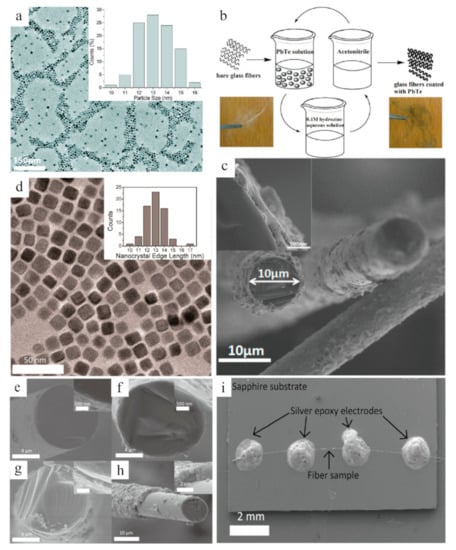 Figure 2. (a) TEM image of PbTe nanocrystals; upper inset is the size distribution of PbTe nanocrystals. (b) Scheme of the coating procedure to fabricate the bare glass fibers and PbTe nanocrystal-coated glass fibers. (c) SEM image of glass fibers coated by PbTe nanocrystal with a thickness ~300 nm. Reproduced with permission [34]. Copyright 2012, American Chemical Society. (d) Low-resolution TEM image of PbTe nanocrystals with the inset of size distribution. (eh) Cross-section SEM images of cut ends of glass fibers based on PbTe samples. (i) SEM image of the PbTe fiber sample used for 3ω measurements. Reproduced with permission [38]. Copyright 2013, American Chemical Society.