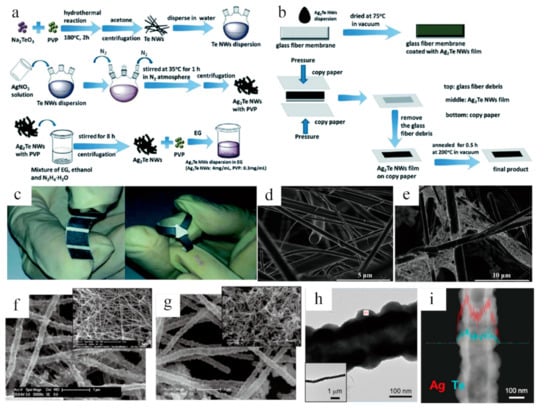 Figure 3. (a) Schematic diagram demonstrating Ag2Te nanowires and (b) the detailed process of fabricating paper coated with Ag2Te films. (c) One piece of paper constructed by four sheets of parallel (9 mm × 5 mm) Ag2Te nanowire films and a clover-like shape with three sheets (20 mm × 3 mm). (d) Representative SEM images of Ag2Te glass fiber sheet and (e) coated with Ag2Te nanowires dispersions. Reproduced with permission from Royal Society of Chemistry [41]. (fg) High-definition SEM images of synthesized AgxTey hollow nanofibers; inserted are low-magnification pictures. (h) The TEM pictures and (i) line-scan EDS analysis of AgxTey nanofibers. Reproduced with permission [40]. Copyright 2015, American Chemical Society.