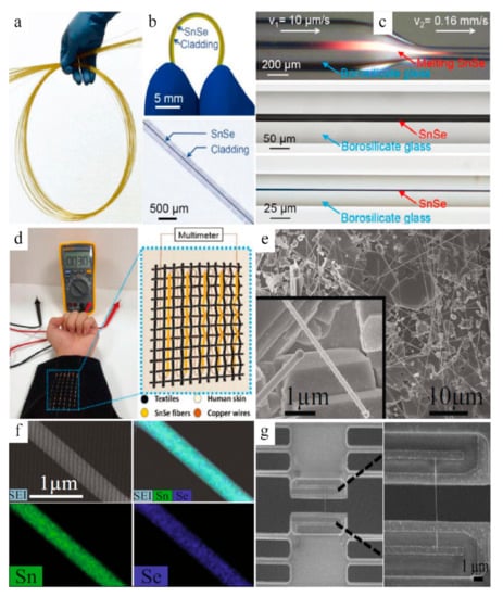 Figure 4. (a) Photograph of SnSe fibers. (b) Single SnSe fiber and its optical microscope image without polymer coating. (c) Fabrication of single-crystal SnSe-core fiber based on CO2 laser taper process. (d) Demonstrations of multidimensional SnSe fabric for converting heat to electricity. Reproduced with permission [31]. Copyright 2020, Wiley. (e) Scanning electron microscopy (SEM) image of the as-grown SnSe nanowires. (f) Energy-dispersive X-ray spectroscopy mapping for a measured SnSe nanowire (480 nm diameter). (g) The low- and high-magnification SEM images of SnSe nanowire, from left to right, transferred onto the microdevice. Reproduced under a Creative Commons Attribution 4.0 International License [50]. Copyright 2018, Springer Nature.