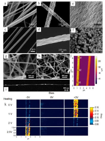 NaCo2O4, one of the potential oxide thermoelectric materials which carries a variety of attractive features of nontoxic and good chemical stability in the air or high temperature, possesses a layered crystalline structure similar to Ca3Co4O9 and Bi2Sr2Co2Ox [51,52,53,54]. Recent reports reveal ZT values of 1.2 and 0.8 for single-crystal NaCo2O4 and polycrystalline NaCo2O4. In addition, literature reveals that polymer or ceramic fibers have been prepared by the convenient electrospinning. The lengths and diameters of internal fibers prepared by this approach can be achieved with a few microns to tens of nanometers through controlling the types of polymers and synthesis conditions [55,56]. Drawing support from a sol–gel-based electrospinning technique [57], the thermoelectric nanofibers with grainsize as small as 10 nm have been achieved in the NaCo2O4 system, which can extend the applications of flexible thermoelectrics. As shown in Figure 5a–d, different solvents of methanol and water treated with annealing lead to distinctive morphology of NaCo2O4 nanofibers. The nanofibers in Figure 5a,c show the continuous fibrous morphology with smooth surface before annealing, and the surfaces of nanofibers become rough and porous after calcination due to the volatile polyvinylpyrrolidone (PVP) polymers (Figure 5b,d). To further verify this influence of temperature, the SEM images of as-spun mat without annealing, and another one with 750 °C heating for 10 min, are displayed in Figure 5e,f, respectively. Such results demonstrate that it is important to control the calcination time for three-dimensional growth mode of grains only. Interestingly, another vivid case of synthetic NaCo2O4 nanofibers is built on the calcination of electrospinning CH3COONa/Co(CH3COO)2/PAN precursor mixture, indicating an opposite effect of temperature on nanofiber growth. As shown in Figure 5g,h, compared with the original composite nanofibers (CH3COONa/Co(CH3COO)2/PAN) in Figure 5g, the diameters of NaCo2O4 nanofibers became even smaller about 30–80 nm after annealing at 400 °C (Figure 5h). Furthermore, by increasing the calcination time to 5 h, a single aligned NaCo2O4 nanofiber collected over a gap formed between two strips of silicon substrate [58] exhibits the long-range orderly filamentous characteristic (Figure 5i). The corresponding electrical and thermal transport properties of the NaCo2O4-based fiber system can be measured by the local I–V curve on three spots of the nanofiber. However, the difference in color contrast reflects the disparity of overall electrical conductivity for NaCo2O4 fiber (see Figure 5j). Meanwhile, the electrostatic force microscopy (EFM) mapping equipped with a thermal probe [59,60] could display the changes at surface potential (electrical conductivity) of the fiber under different heating voltages (temperature gradient), as shown in Figure 5k. Such a phenomenon helps us to better observe the thermoelectric performance of a single fiber.