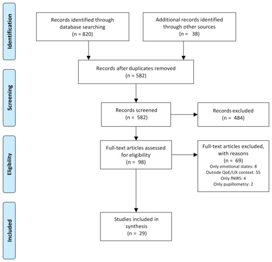 This review represents an initial effort to develop a QoE/UX evaluation architecture based on the interpretation of users’ cognitive states. The exclusion criteria were mainly constrained by the research scope–context, mental states, signals, and potential users—considering the equipment and current conditions of our laboratory and the time constraints of the review, among others.