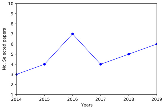 The full-text analysis included 98 papers, of which 56% were discarded because they were outside the QoE/UX context; this gives the insight that related research has been performed, but a lack of research remains in the specific context of this review. Figure 2 presents the chronological distribution of the 29 selected papers; a maximum of seven papers published in 2016 and an average of five papers per year in the period 2015–2019 were observed.