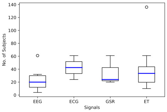 Chai et al. [46] investigated the relationship of frontal alpha EEG asymmetry with experience and difficulty in the task when interacting with a set of mobile applications, not finding meaningful correlations. In [47], the relationship between eye-tracking metrics with self-efficacy, risk, ease-of-use, and usefulness perception in tasks with a software assistant was sought. Various correlations were found, the strongest one being between the perceived ease-of-use and the number of fixations that turn into clicks, providing a guideline for considering the interaction mechanisms with the analysis of inherent signals to humans. In another article [48], the relationship of GSR characteristics with performance metrics was analyzed, identifying that the tasks with a lower rate of completion have a non-significant tendency to cause higher GSR values and a significant correlation between attractiveness, efficiency, dependability, and novelty with GSR data. On the other hand, the usability of a web application was evaluated looking for correlations between subjective questionnaires, EEG, and emotions through facial expressions [49], concluding that EEG measurements are necessary since it was observed that the decrease in motivation was not reflected in the self-reports, but in the increase of brain activity.