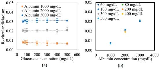 The preparation method of samples is described in detail in []. In brief, deionized water (DI), D-glucose (Merck Ltd., Darmstadt, Germany), and 2% lipofundin (lipofundin MCT/LC1 20%, B|Braun) were mixed with an appropriate ratio. The concentrations of the glucose sample were 0~500 mg/dL in 100 mg/dL increments. Additional glucose tissue phantom samples with concentrations of 60 and 80 mg/dL were also prepared to simulate a small glucose concentration situation. The samples were mixed with three different bovine serum albumin (Sigma Aldrich, Darmstadt, Germany) concentrations, namely 1000, 2000, and 3000 mg/dL. Figure 3 shows the experimental results obtained for the circular dichroism (R) properties of the various samples. As shown in Figure 3a, the circular dichroism remained unchanged as the glucose concentration increased for all three values of the albumin concentration. However, for a constant glucose concentration, the R value increased from 0.01 to 0.03 as the albumin concentration increased from 1000 to 3000 mg/dL. Figure 3b confirms that for all values of the glucose concentration, the circular dichroism increased linearly with albumin concentration. The average standard deviation of the measured values of R over four repeated tests was found to be 1.6 × 10−2.