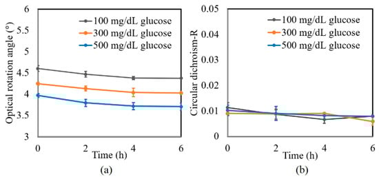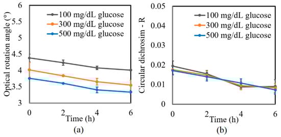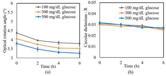 A further series of experiments was performed to investigate the protein glycation effect of albumin by measuring the variation in the optical rotation angle and circular dichroism of glucose tissue phantom solutions with concentrations of 100, 300, and 500 mg/dL, respectively, over a period of six hours. Each sample was mixed with three different albumin concentrations, namely 1000, 2000, and 3000 mg/dL. The corresponding results are presented in Figure 4, Figure 5 and Figure 6, respectively. For all three albumin concentrations, the optical rotation angle of the glucose samples decreased rapidly over the first two hours and then continued to decrease more slowly over the remaining four hours. The CD also reduced continuously over the considered time period. Furthermore, the sample with 2000 mg/dL of albumin showed a higher reduction in CD than the samples with 1000 and 3000 mg/dL of albumin. It is suspected that for glucose concentrations over the range of 0–500 mg/dL, the protein glycation rate is highest at an albumin concentration of 2000 mg/dL. Overall, the results confirmed that in the presence of albumin, protein glycation occurs, which results in a lowering of the sugar content in the solution [], as well as reductions in the extracted values of the optical rotation angle and circular dichroism accordingly. The average standard deviations of the extracted values of γ and R over four repeated tests were determined to be 7.9 × 10−2° and 2.4 × 10−3, respectively.