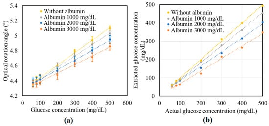 Figure 7a shows the experimental results obtained for the variation in γ of the tissue phantom solutions with the glucose concentration given the addition of albumin in concentrations of 0, 1000, 2000, and 3000 mg/dL. For each of the albumin concentrations, γ increased linearly with glucose concentration over the considered measurement range. However, for a constant glucose concentration, γ decreased with albumin concentration due to the glycoxidation effect. The standard deviation of the measured values of γ over four repeated tests was found to be 5.2 × 10−2.