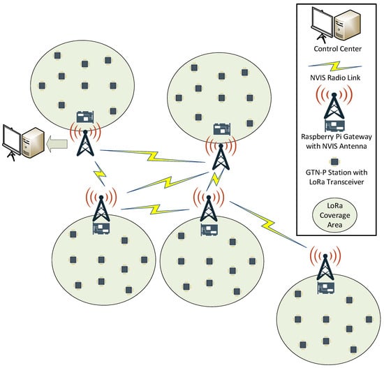 The operation of the backbone network can be summarized as follows. Each NVIS node will act as a concentrator, gathering the data from every GTN-P station inside their LoRa coverage area. Once all possible data are collected, the NVIS node will forward it to the node connected to the control center, following the path determined by the routing protocol through the backbone network.