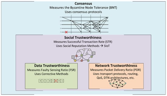 At the Social Trustworthiness Layer, most solutions tend to use reputational mechanisms to determine which nodes to trust when exchanging information. This reputation is commonly based on previous transactions’ feedback to build an opinion for the node’s trustworthiness []. More complex and robust mechanisms also incorporate parameters such as the indirect opinion of other nodes, the relevance (weight) of each transaction, the node’s centrality, the node’s computational capacity, and the type of relationships between the nodes [].
