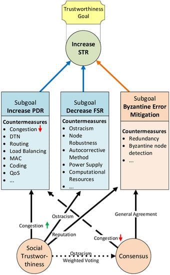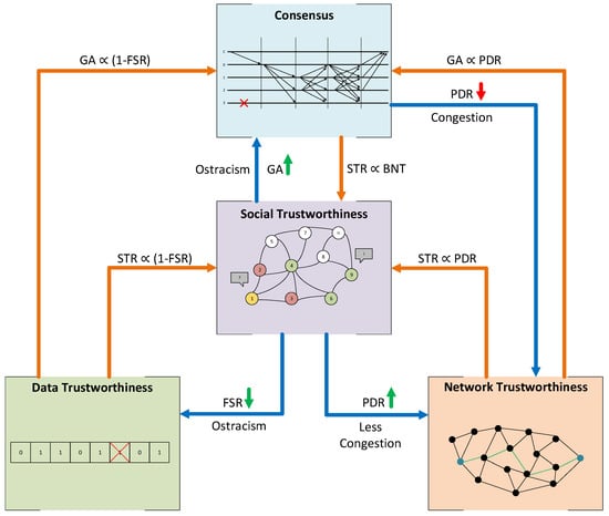 Although the dependencies between the layers and metrics of our model have been identified, it is still challenging to quantify the effect of looped dependencies on the system’s trustworthiness. We identified two actions that can provoke a direct looped dependency. First, if Social Trustworthiness Layer is used to ostracize the lowest reputation nodes, their sensed values will be omitted, decreasing the FSR and eventually increasing the STR. However, suppose more traffic than supported by the network is concentrated on the links that lead to most reputation nodes. In that case, it is possible to create network congestion that will decrease the PDR and eventually decrease the STR. Second, implementing a consensus mechanism might help tolerate byzantine nodes and faulty network links, which eventually increases the STR. Nonetheless, suppose the network bandwidth is not large enough to allocate the extra traffic introduced by the consensus mechanism. In that case, the network may suffer from congestion, decreasing its PDR and eventually decreasing the STR.