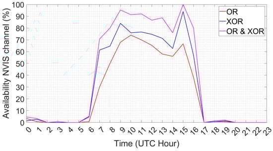 NVIS link availability depending on solar activity and the ionosphere’s state []. The graph’s legend is defined as follows: OR refers to the performance of the ordinary wave, XOR refers to the performance of the extraordinary wave received. OR and XOR refer to the total performance between both the ordinary and extraordinary modes. We have the copyright of [], it belongs to the GRITS research group from La Salle.