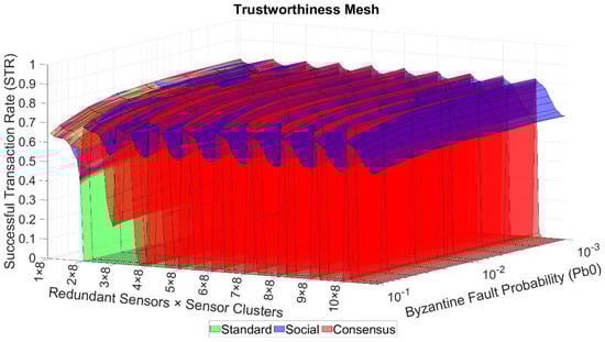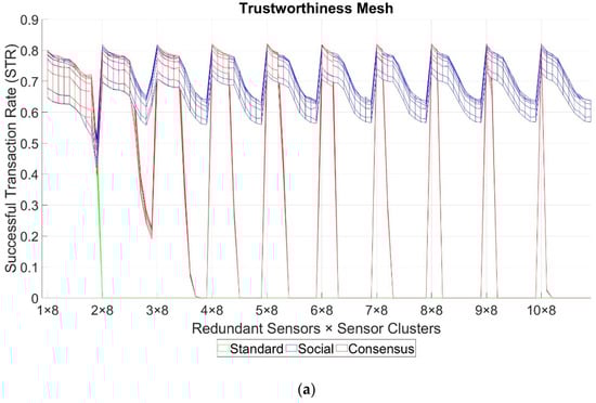 In that sense, we considered that the system’s overall trustworthiness can be measured with the STR metric, which is the one affected by the four layers of our model, and intrinsically incorporates the effects of the other three metric values (i.e., FSR, PDR, and BNT). Moreover, notice that without implementing the extension layers, the STR can still be computed, which will combine the effects of the base layers (i.e., Data and Network Trustworthiness).