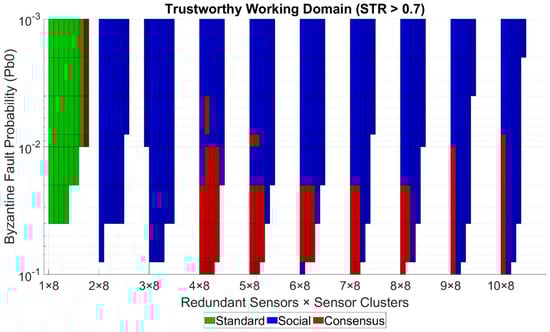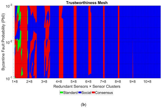 The Consensus Layer is directly affected by the other three layers. If FSV (Data Layer) is closer to 0, it means that nodes tend to measure the sensed values correctly, so they will be more prone to reach a correct general agreement. From the Social Layer, it is possible to ostracize those nodes with a lower reputation (which should be the ones with more false sensed values) if the application can afford to lose the data from them. In this case, if nodes with the worst reputation were omitted, it should be more probable to reach a correct general agreement for the rest of the nodes. Finally, suppose the PDR (network trustworthiness) is closer to 1. In that case, it means that the whole network delivers the most packets unaltered and on time, so fewer nodes will be considered byzantine due to the network issues and reaching correct general agreements will be more feasible. It is important to notice that all these dependencies do not affect the Consensus Layer metric, the byzantine node tolerance, which depends only on the consensus algorithm used and the total number of nodes participating in the consensus group.