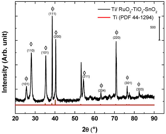 XRD pattern for the DSA® Ti/RuO2-TiO2-SnO2 (50:40:10 atom. %): (Φ) RuO2 tetragonal; (◊) TiO2.