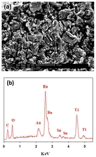 The surface morphology and composition of the formed films were analyzed using the SEM and EDS techniques. Figure 2a depicts the characteristic electrode surface morphology of DSA® electrodes with a mud cracked structure [29,34]. The EDS analyses of Figure 2b allowed identifying signals for the three metals in the mixed metal oxide composition of Ti/RuO2-TiO2-SnO2 (50:40:10 atom. %). The EDS demonstrates the presence of Sn in the electroactive film despite not having observed an associated crystalline structure in XRD (see Figure 1), which allows inferring its solid solution in TiO2 and RuO2. Table 2 collects the atomic composition determined through the EDS analyses, and indicates a good correlation between experimental and nominal compositions. Thus, the DSA preparation method effectively formed a mixed metal oxide film from the polymer precursor calcination.