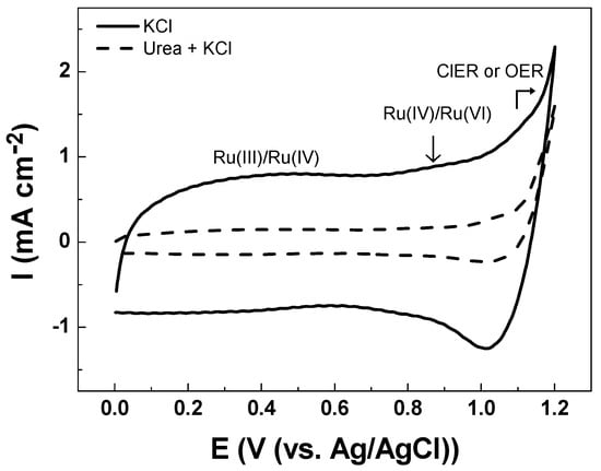 The voltammetric charge can be used as a relative measure of the electrochemically active area. The voltammetric charge (q) is used to evaluate the electrochemically active area of noble metal oxide electrodes. It is obtained through the integration of the cyclic voltammogram characteristic of the electrode and is proportional to the number of active sites [30,31]. Therefore, the anodic and cathodic charge densities, qa and qc, were determined by the integration of region of the i vs. E curve measured between 0.2–1.0 V vs. Ag/AgCl (qa = 13.66 mC cm−2 and qc = 13.05 mC cm−2). The influence of chlorine active species was assessed by conducting experiments in inert electrolyte consisting of 0.033 mol L−1 Na2SO4 solutions in the absence and presence of 2.68 × 10−3 mol L−1 NaClO.