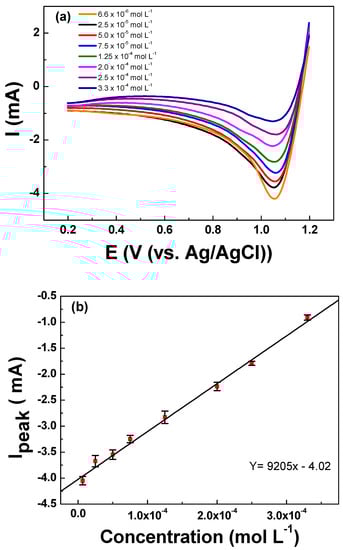(a) Linear sweep voltammetry curves registered for increasing concentrations of urea ranging from 6.66 × 10−6 to 3.33 × 10−4 mol L−1 in KCl 0.10 mol L−1. (b) Linear relationship between the registered Ipeak vs. the concentration of urea showing excellent fitting for a linear relationship. LSV curves were registered on the Ti/RuO2-TiO2-SnO2 (50:40:10 atom. %) working electrode at υ = 50 mV s−1 scan rate after holding 1.2 V vs. Ag/AgCl for 60 s as analytical preconditioning.