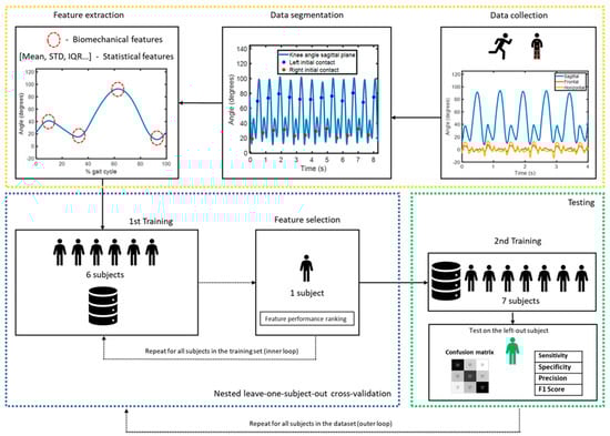 The machine learning-based method that we implemented to detect fatigue in this study is summarized in Figure 1. Our workflow consisted of three main stages: data collection and processing (highlighted in yellow), development of the fatigue detection classifier (highlighted in blue) and performance evaluation of the classifier (highlighted in green). Each step in the workflow will be described in more detail in this section.