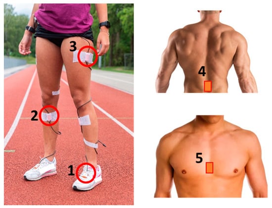 Measurement setup. IMUs are placed at both feet (1, highlighted left foot), both tibias (2, highlighted right tibia), both thighs (3, highlighted left thigh), pelvis (4) and sternum (5).