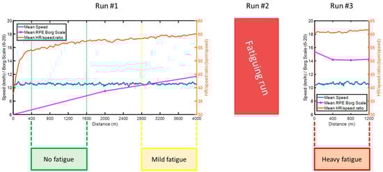 Mean speed (km/h), RPE Borg Scale (6–20) and HR/speed ratio (bpm/speed) for the runs performed in this study. The first run lasted 4000 m and was performed at a speed level controlled by a cyclist; the second (fatiguing) run was performed at increasingly higher speed and lasted between 400 m and 1200 m, until a RPE of 16 or higher was reached; the third run lasted 1200 m and was performed at a speed level controlled by a cyclist and equal to the first run. The three identified fatigue conditions are highlighted in green (400–1600 m), yellow (2800–4000 m) and red (0–1200 m post fatiguing run).