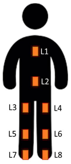 IMU location codes: L1, sternum; L2, pelvis; L3, right thigh; L4, left thigh; L5, right tibia; L6, left tibia; L7, right foot; L8, left foot.