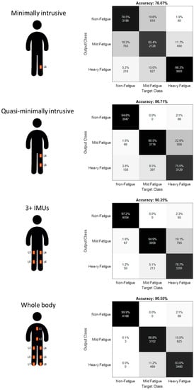 Table 5 presents the performance of our random forest classification algorithm in detection of the three fatigue levels for the sensor configuration that resulted in highest accuracy from each of the four IMU-setup configuration categories. For the minimally intrusive category, best configuration consists of one IMU placed on the left tibia (Accuracy = 0.761 ± 0.220). For the quasi-minimally intrusive category, best configuration consists of two IMUs placed on the left tibia and the left thigh (Accuracy = 0.867 ± 0.112). For the 3+ IMUs category, best configuration is represented by four IMUs on the left and right tibias and left and right thighs (Accuracy = 0.903 ± 0.085). Whole body configuration of eight IMUs resulted in an accuracy of 0.905 ± 0.081. Confusion matrices with aggregate classification accuracy for all datapoints from all subjects are shown in Figure 5.