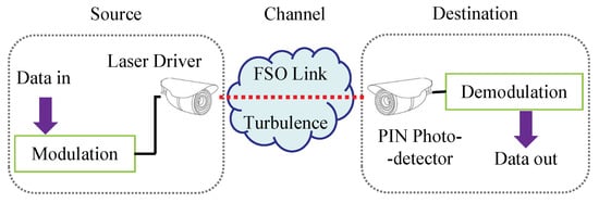 A diagram of an FSO communication system with modulation and demodulation schemes is shown in Figure 1. The electrical signal is first modulated using the modulation scheme, and then converted into an optical signal by a laser driver. Following this, the optical signal is transmitted to the receiver through atmospheric turbulence. Refraction, reflection, scattering and other influences arising from the variation in the refractive index of the turbulence environment result in fluctuations in the phase and amplitude, referred to as scintillation. The received signal is then converted into an electrical signal by a PIN photodetector and finally demodulated using the corresponding demodulation model. The signal after demodulation can be written as