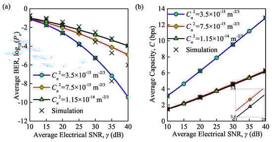 Here, we further investigate the average BER and channel capacity of the communication system under moderate-to-strong turbulence, which is modeled by Gamma–Gamma distribution as we have mentioned in Section 2.