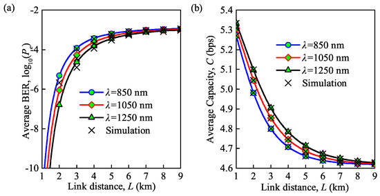 The average BER becomes smaller with an increase in the wavelength, while the average capacity becomes higher during this period. Note that the average capacity decreases suddenly while that of the average BER becomes slow when the link distance is very large. For instance, for = 850 nm, the average BER increases from to when the link distance is increased from 3 to 4 km, and the average capacity decreases from 16.1 to 15.0 bps. However, the average BER increases from to , and average capacity decreases from 8.9 to 7.4 bps when the link distance is increased from 7 to 8 km.