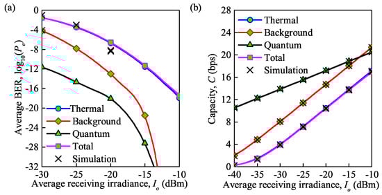 In this section, the effects of the system parameters and channel parameters on the performance of the FSO communication system are analyzed. The relevant parameters used for the simulation are shown in Table 1. Note that the value of background radiation in Table 1 is considered, including sky irradiation and Sun irradiation with a wavelength of 850 nm and an optical filter bandwidth of μm, which are selected from [13,28]. The results of the simulations for both the average BER and the average channel capacity of the FSO communication system are given below. Meanwhile, the accuracy of the analytical expressions is corroborated by Monte Carlo (MC) simulations using over independent runs.