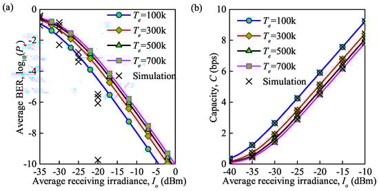 As analyzed above, the thermal noise has a more obvious influence on the average BER and average channel capacity than the background noise and the quantum noise. Therefore, only the influence of the thermal noise on the system performance, including the average BER and average capacity, is further studied. Note that the thermal noise is correlated with several parameters, including temperature , received irradiance , and symbol transmission rates based on the expression .