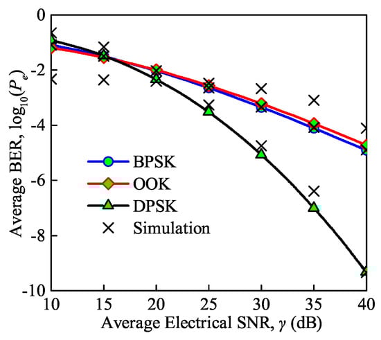 The average BER versus the average electrical SNR under the BPSK, On-Off Keying (OOK) and Differential Phase Shift Keying (DPSK) modulation schemes for moderate turbulence is shown in Figure 9. Note that the background noise, thermal noise, and quantum noise are considered in this simulation as the total noise. We can conclude that with DPSK and BPSK modulation the analytical and MC simulation results have a good match validating the accuracy of the derived analytical expression for the average BER, while there is a small departure with OOK modulation. The average BER decreases gradually with an increase in the SNR. However, the average BER of the FSO communication system with DPSK modulation decreases more sharply than in the other modulation schemes. For instance, it can be observed that with DPSK modulation, the BER decreases from to , while the average BER of the communication system with BPSK modulation and OOK modulation decreases from to and from to , respectively, as the SNR increases from 20 to 30 dB. In addition, OOK modulation performs best when the SNR is less than 15 dB, while DPSK modulation performs best when the SNR is larger than 15 dB.