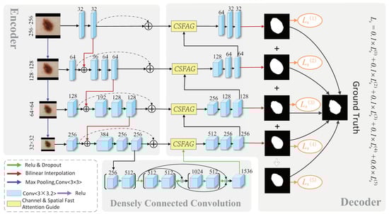 - Embed the proposed CSFAG module into the jump connection of the M-Net segmentation network to form CSAG and DCCNet. In the last step of the CSAG and DCCNet encoding path, densely connected convolutions are used to replace ordinary convolutional layers, and through the idea of “collective knowledge”, the gap between low-level features is bridged and features are effectively aggregated.