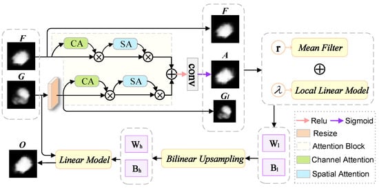 The input of the CSFAG module includes the guided feature map G and the filtered feature map F, and the output is a high-resolution feature map O. First, we use bilinear interpolation to scale the guiding feature map G to generate a low-resolution feature map . and filtered feature map F through attention module to generate attention feature map A. We minimize the reconstruction error [50] between and F to obtain the coefficients and of the CSFAG module. By bilinearly up-sampling and , we obtain the coefficients and which match the guiding feature map G. Finally, the output O of the CSFAG module is obtained through linear transformation.