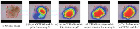 In order to further demonstrate that the CSFAG module can help the model generate clearer boundaries, highlight the lesion area and reduce background influence, We randomly selected a melanoma dermoscopy image in the test set of the ISIC2017 data set for visual analysis. We select the CSFAG module on the jump connection in the fourth layer of the CSAG and DCCNet model as the test module. For showing the role of the CSFAG module more clearly, we perform three convolution operations on the input of the CSFAG module, the output of the intermediate attention module and the final output of the CSFAG module to reduce the dimensionality. Then use bilinear interpolation to restore the feature size to . We have drawn a CAM heat map to more clearly show the changes produced by the CSFAG feature map. As shown in Figure 4, we can clearly see from the CAM heat map, after the attention module in the CSFAG module, the features are more focused on the lesion area. In particular, the final output results generated after the fast guide filter, the model further aggregates the characteristics of the space and the channel, enhances the discriminative ability of the network, and makes the network good use of the given characteristics.