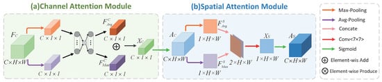 The attention mechanism on the channel has been proposed in Hu et al.’s SENet [37], and it has been verified that it can improve network performance. The channel attention module and the spatial attention module [41] are shown in Figure 5. The Channel Attention Module compresses the feature map in the spatial dimension to obtain a one-dimensional vector before performing operations. As shown in Figure 5a, the input feature map is passed through global max pooling and global average pooling based on width and height respectively, and then passed through a multilayer perceptron (MLP). The MLP output feature maps and are summed element-by-element, so that channel attention maps can be generated, as shown in Equation (6). After the sigmoid activation operation, the final channel attention feature map d is generated, as shown in Equation (7). The channel attention featuremap and input featuremap are subjected to elementwise multiplication operations to generate the input features required by the spatial attention module.