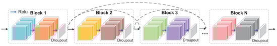 The densely connected convolution module [51] is composed of multiple dense blocks, and each dense block performs two convolution operations. The structure of densely connected convolution is shown in Figure 6. The distinctive feature of the densely connected convolution module is that the input of each block is the concatenation of all feature maps generated by all previous blocks, and each layer performs a series of continuous transformations. The idea of densely connected convolution has some advantages over conventional convolution. First, it helps the network learn diversified functional characteristics, rather than redundant functions. In addition, this idea allows information to flow through the network and reuse functions to increase the representativeness of the network. Dense connectivity ensures the maximum information path between layers by connecting all layers. The output features of all convolutional layers in the dense block are connected in series along the channel axis. Let and be the input and output of the tightly connected dense block, respectively. The output of the dense block can be obtained in the following manner.