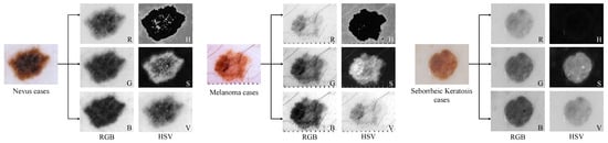 We combined 150 test data and 2000 training data as training data for the network. In order to train our proposed network structure more conveniently, we scaled the width of images of different sizes to 256 px according to the aspect ratio, and then filled the black borders on the top and bottom of the image to increase the height to 256 px. In order to better allow the network to learn the brightness, tone, and vividness of the dermatoscope image, we converted the image in RGB format to HSV format. As shown in Figure 7, the color components of R, G, and B in the RGB image were all related to the amount of light irradiated to the object. Therefore, the image description based on these components made it difficult to distinguish the object. Unlike RGB, HSV separates brightness or image intensity from chromaticity or color information and is more stable to changes in external lighting. HSV images can detect objects with specific colors and reduce the influence of light intensity from the outside. Therefore, we used HSV images as an effective supplement to training data to train the segmentation network. At the same time, the two formats of images were rotated horizontally, vertically, horizontally and vertically to expand the number of training images, and finally 17,200 training images were generated.