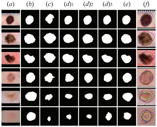 Visualized results of structural ablation experiments. The first two lines are Benign Nevus, the middle two lines are Melanoma lesions, and the last two lines are Seborrheic Keratosis lesions. (a) Original image; (b) the ground truth; (c) U-Net; (d) 1. M-Net; (d) 2. M-Net+Dense Convolutions; (d) 3. M-Net+ CSFAG; (e) CSAG and DCCNet model; (f) ground truth (red) and U-Net+ (purple), MNet (green), M-Net+Dense Convolutions (yellow), M-Net+CSFAG (black) and ours (blue) segmentation results comparison chart. All pictures are preprocessed.