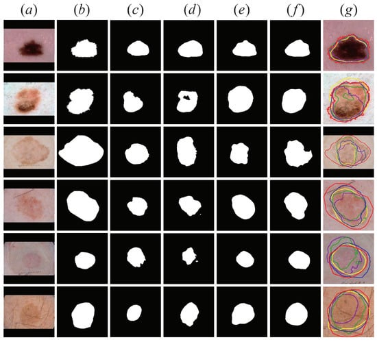 As presented in Figure 8, we visually display the segmentation results of UNet, MNet, M-Net+Dense Convolutions, M-Net+CSFAG, and CSAG and DCCNet proposed in this section. For Figure 8f, we zoomed in on the lesion area on the image to visually show the comparison between the five models verified in the structure ablation experiment and the ground truth segmentation results. It can be clearly seen in the figure that, compared with UNet, the segmentation result of MNet had clearer edges and more concentrated recognition of the lesion area. For M-Net+Dense Convolutions, M-Net+CSFAG and ours, compared with MNet, the segmentation results on moles and melanoma lesions had little difference. We believe that for dermoscopic images of moles and melanoma lesions, due to the large difference in the front background and the relatively concentrated lesion area, a simpler model could obtain better segmentation results. However, for the small difference between the front background and the blurred boundary of the lesion area, similar to the dermoscopic image of the last two rows in Figure 8, it was difficult to obtain a more ideal segmentation result using a more basic segmentation network structure such as UNet or MNet. Therefore, CSAG and DCCNet was designed in this paper. From the segmentation results of the last two rows in Figure 8, CSAG and DCCNet could identify larger lesion areas for images with small differences in the front background and blurred boundaries of the lesion area, the segmentation result obtained was closer to the ground truth.