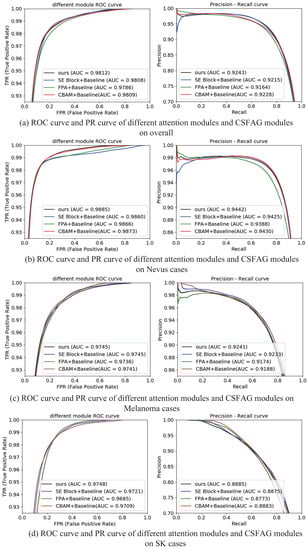 Table 5 and Table 6 show the segmentation performance of the model formed by the combination of SE Block, FPA, CBAM and Baseline and CSAG and DCCNet (ours) on three skin lesions. From the perspective of various indicators, the segmentation performance of the network structure with the added attention module was greatly improved compared with the baseline. For CSAG and DCCNet, especially in the three key indicators of DIC, JAC, and MCC, CSAG and DCCNet has achieved good results. We think the reasons why CSAG and DCCNet could obtain higher results are considered as follows. SE Block only studied the channel attention mechanism of feature maps, and ignored the information in the spatial dimension. Although the FPA module used the pyramid structure to expand the range of the receptive field, it lost the pixel-level positioning information, which had a greater impact on the dermoscopic image segmentation. CBAM could learn what to pay attention to and where to pay attention in the channel and spatial dimensions, but it is difficult to integrate the structural information contained in low-resolution feature maps and high-resolution feature maps, and retains less edge information. In addition, for the parameters of each model, SE Block only paid attention to the characteristics at the channel level, making the model parameters smaller. The FPA module uses and large convolution kernels, resulting in a large amount of model parameters. CBAM applies attention to both channel and spatial dimensions at the same time. Compared with SE Block, the amount of CBAM module parameters also increased. However, the CSFAG module proposed in this paper used the CBAM module as the attention module and combined the guide filter, so the parameter amount was slightly higher than the CBAM module parameter amount.