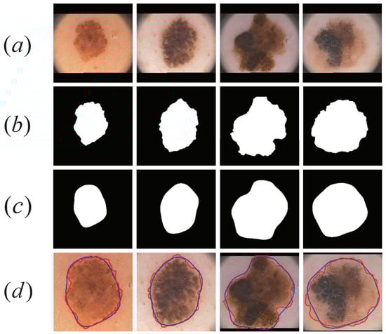 Visualization results for the PH2 data set. (a) Original skin lesion image; (b) ground truth corresponding to the lesion. (c) CSARM-CNN model lesion segmentation results; (d) ground truth (red) and segmentation results (blue) comparison chart.