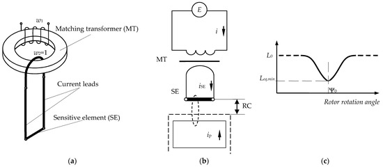 The sensor consists of three elements (Figure 2a): a matching transformer (MT), “non-inductive” current leads made as closely spaced and isolated coaxial cylinders and a SE in the form of a conductor segment. The current leads and the SE form the secondary MT winding. The primary MT winding is included in the MC with pulsed supply which implements the method of the first derivative [16].